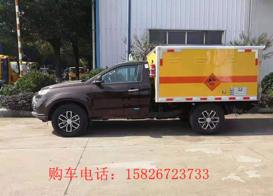 皮卡火工品运输车,爆破器材运输车运输介质:该车用于运输具有独立容器(瓶)包装的: 黑huo药,压缩黑火yao,电引爆雷guan,爆破炸药,点燃导火索,专用烟火制品,类项号:1.1D,1.1D,1.1B,1.1D,1.4G,1.1G;危险货物运输车种类:EX/Ⅱ。