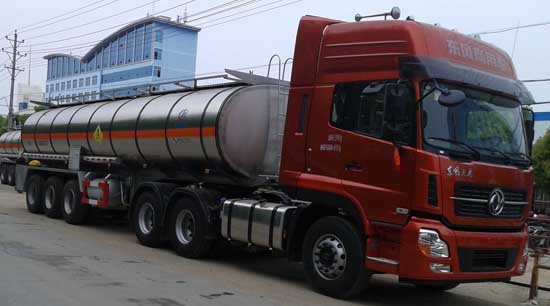 罐体有效容积:26.6立方米,介质名称:硝酸铵,密度:1.2吨/立方米,类项号:5.1,罐体外形尺寸(长×长轴×短轴)(mm):10000×2500×1710(内部尺寸为9800/2300/1510,罐体保温层厚度为100mm)。采用适用于牵引危险品运输半挂车的牵引车。防护材料:Q235A碳钢,连接方式:左右侧面及后下部防护均采用焊接连接,后部防护断面尺寸(mm):140×50,后部防护离地高度(mm):440。ABS生产厂家:广州市科密汽车制动技术开发有限公司,ABS型号:CM2XL-4S/2K(4S/2M)。