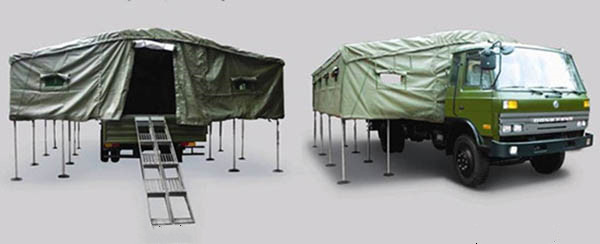 越野卡车宿营车:适合于部队、勘探、抢险等野外作业环境。其底板采用铁木混合结构,折叠式双边板,增设活动支撑杆,可拆式帐篷。平时,可做普通高栏板车厢使用;需野营时,放平双边板并支撑好,搭好帐篷,就可形成一座面积不同的高台帐篷,可供不同编制人员住宿使用。