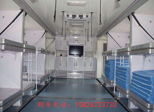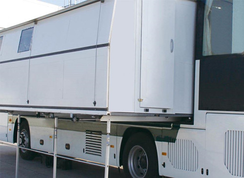 军用、警用宿营车、通信指挥车、车厢扩展方式为机械压簧与人力辅助相结合的方式,完成对顶、底板的扩展与撤收。顶板的支撑元件为机械压簧,扩展装置为双层套筒内装压簧结构,外套筒在上,内套筒在下。外套筒的一端与扩展顶板上的支座铰接,内套筒的一端与固定在间壁上的支座铰接。当展开顶板时,在人力辅助下,将扩展顶板拉启约10°左右,扩展顶板便可在机械压簧的作用下,开启至80°左右位置,这时用辅助支撑装置将顶板支撑固定。撤收时,先收起辅助支撑装置,用钩杆拉住顶板上的钩环,用力将顶板拉下至垂直位置,即完成顶板的撤收。扩展底板的扩展装置安装于舱内,通过柔性钢丝绳及导向轮将扩展底板与机械压簧连接起来。当展开底板时,需工作人员将锁紧底板的插销打开,然后用钩杆将底板拉至水平位置,再打开调平支撑装置支撑于地面上;撤收时,先收起调平支撑装置,再用钩杆将扩展底板推起至锁固位置,并用插销锁紧。购车电话:15826723733