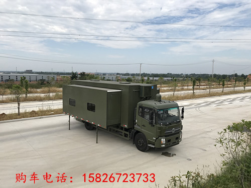 东风天锦多功能军用宿营车,军用24人宿营车主要由东风商用车天锦系列高端二类底盘DFL5160XXYBX2V、扩展宿营方舱、宿营设施、空气调节系统、影视系统、卫生间,洗漱间,电气系统等组成。能够满足24人的住宿,阅读。具有舒适的就寝环境及齐全的卫生设施。能够适应普通公路、沙石路、简易公路及越野特殊使用环境,可靠性好。