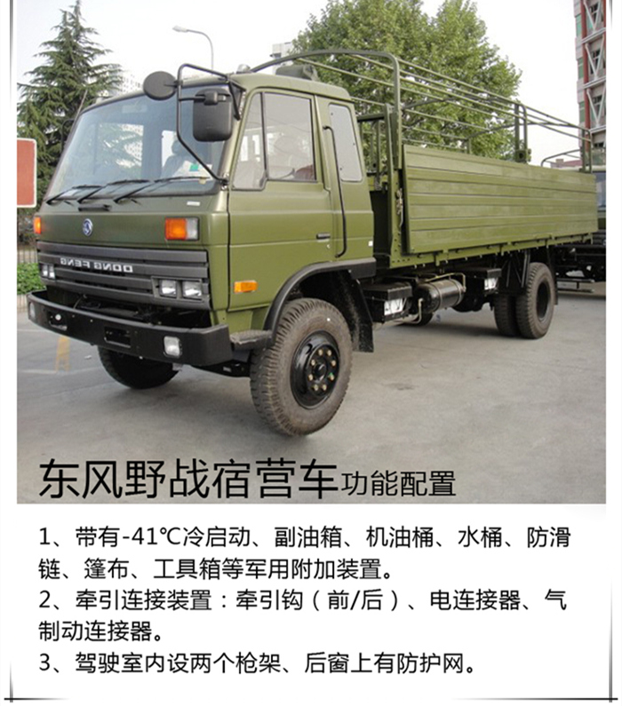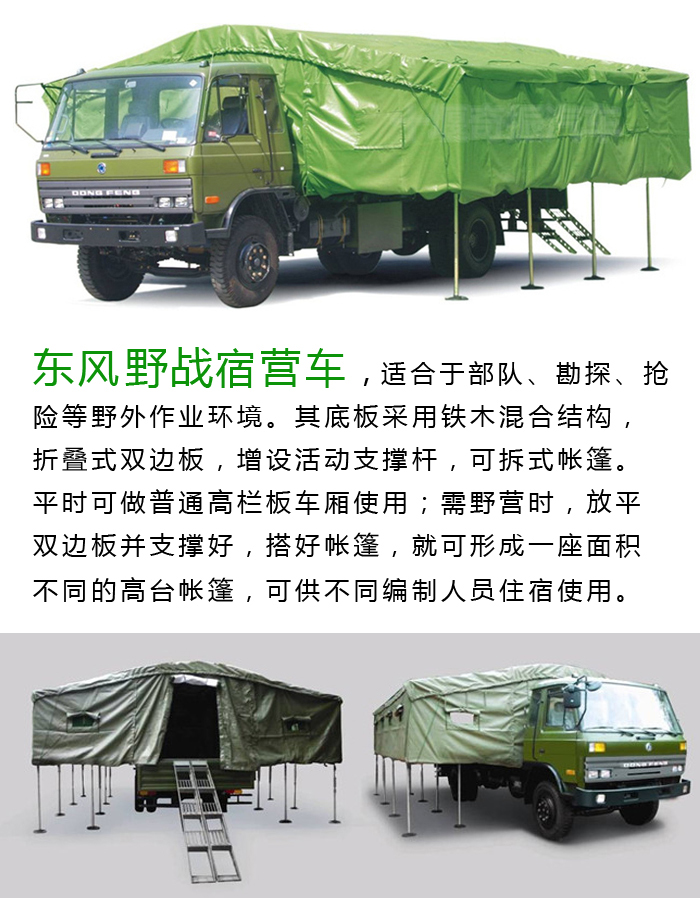 东风平头宿营车:适合于部队、勘探、抢险等野外作业环境。其底板采用铁木混合结构,折叠式双边板,增设活动支撑杆,可拆式帐篷。平时,可做普通高栏板车厢使用;需野营时,放平双边板并支撑好,搭好帐篷,就可形成一座面积不同的高台帐篷,可供不同编制人员住宿使用。购车电话:15826723733