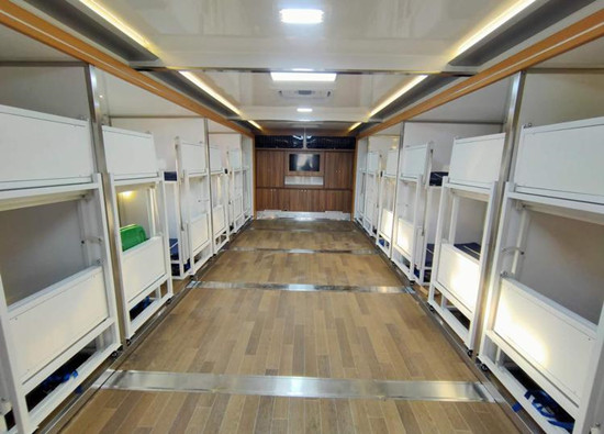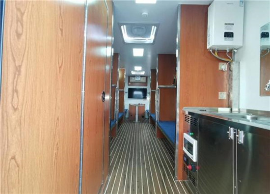 宿营方舱、宿营设施、空气调节系统、影视系统、卫生间,洗漱间,电气系统等组成。能够满足多人的住宿,阅读。具有舒适的就寝环境及齐全的卫生设施。能够适应普通公路、沙石路、简易公路及越野特殊使用环境,可靠性好。整车机动灵活、可靠性高、环境适应性好,性价比高。能够满足多人的住宿,阅读,生活,洗浴,空间利用率高。