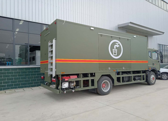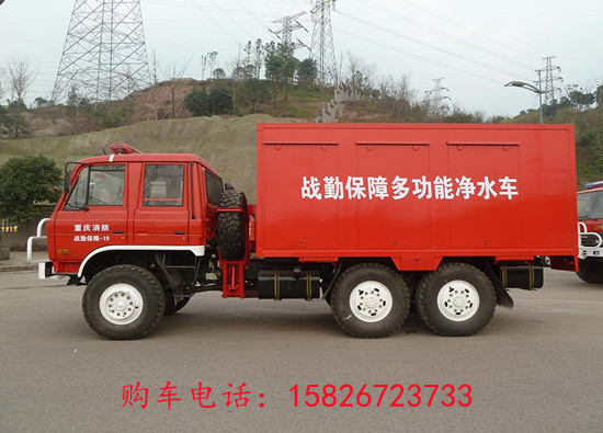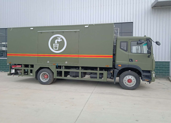 净化饮水保障车是为消防队伍野外执行任务、扑救重特大火灾和抢险救援任务提供饮用水保障的需要而开发研制的一种机动、能把野外较差水源净化为可直接饮用的净水的装备。