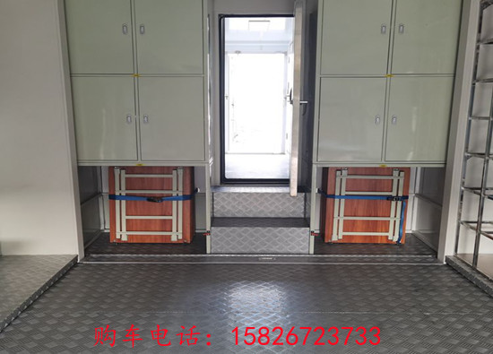 3)宿营舱内配备顶置空调、燃油加热器、顶置电动换气天窗、照明灯、折叠床铺、及电器控制系统等。