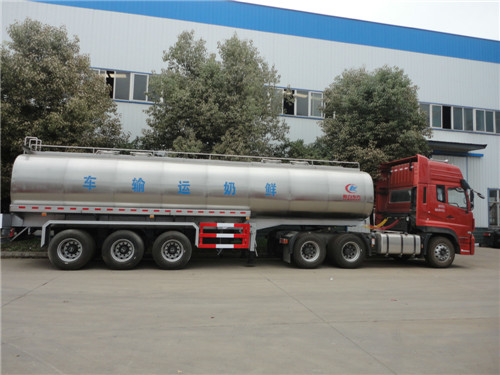 鲜奶半挂运输车、奶罐车、液态食品运输车,鲜奶运输车罐体用食品级不锈钢板制作,罐体外部需作保温层防止鲜奶变质,罐体内部要求光洁、无锐角,一般需要在每个奶舱内加上Cip(清洗装置)。