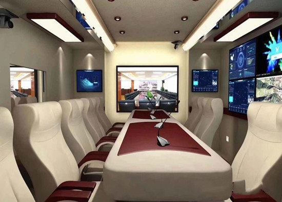 指挥方舱车,根据现场应急指挥工作的实际需要,加装各种专用设备改装而成,既保持了原底盘车的美观外形、豪华内饰和性能,又具有移动办公、通讯指挥、无线传真、数据处理、强光照明、图像监控及传输、视频会议、宣传广播、自供电和安全警示等功能,可以在较短的时间里利用车上的通信设备方便地组织无线通信指挥调度,组成现场移动指挥中心。该车既可独立作为现场通讯中枢,又可作为一个远端通信节点,通过无线传输方式与城市指挥中心相连,进行通讯。
