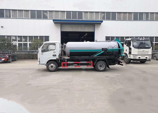 东风多利卡5方吸污车上装配置:专用部分由取力器、传动轴、真空吸污泵、压力罐体、液压部分,管网系统、真空压力表、视粪窗、洗手装置等组成,随车配置大功率真空吸污泵和优质液压系统,罐体封头一次压铸成型、罐体可后开、双顶自卸。罐内污物可通过后盖直接倾倒,具有真空度高(比吸粪车的吸力更大)、吨位大、效率高、用途更广泛等特点。油水分离器,水气分离器,液压自卸装置,专用真空吸污泵,容积压力表,吸物导管,自流阀,真空罐体,连通器(视粪窗),全自动防溢阀,液压套件。采用国内技术领先的吸污专用泵,吸力大,吸程远,特别适合用于市政环卫,厂区,矿山,小区等下水道内的淤积物的抽吸、装运和排卸,尤其是可吸下水道泥浆、淤泥、石子、砖块等较大物体、含水量较小等物质。抽满污(粪)罐体时间:≤5min,吸程:≥10m。自吸自排,寿命长,工作速度快,运输方便。吸污车与吸粪车具有相同原理,但吸污车又与吸粪车有着不同用途。区别就在于吸污车罐体为圆形罐,结构更紧密,可以耐更高压力提供更大的吸力,可用于收集清理运输污水,污泥。